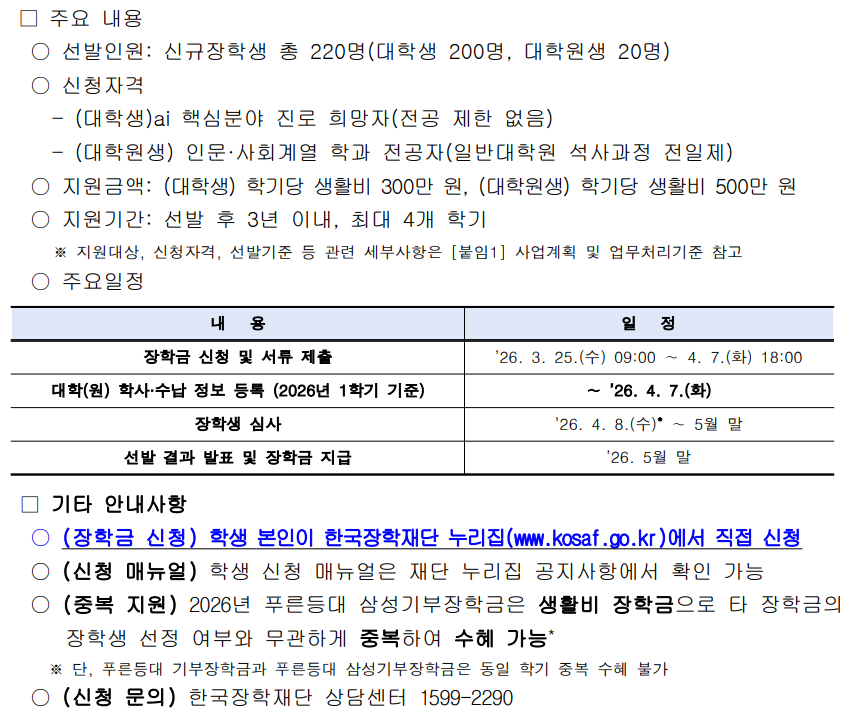 [한국장학재단] 2026년 푸른등대 삼성기부장학금 신규장학생 선발 안내