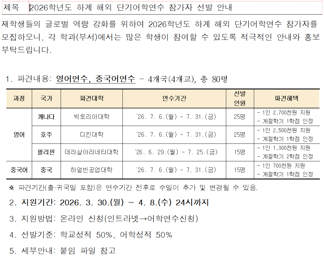 2026학년도 하계 해외 단기어학연수 참가자 선발 안내