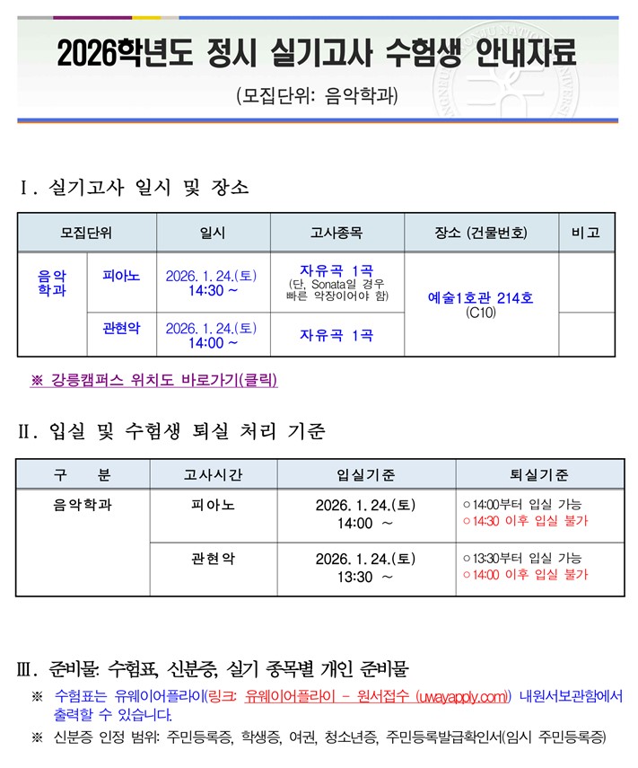 2026학년도 정시모집 음악학과 실기고사 안내(장소 및 유의사항)