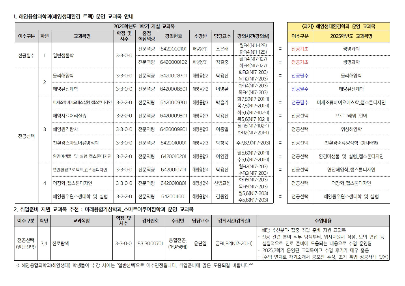 2026-1 해양융합과학과(해양생태환경) 재학생 수강지도