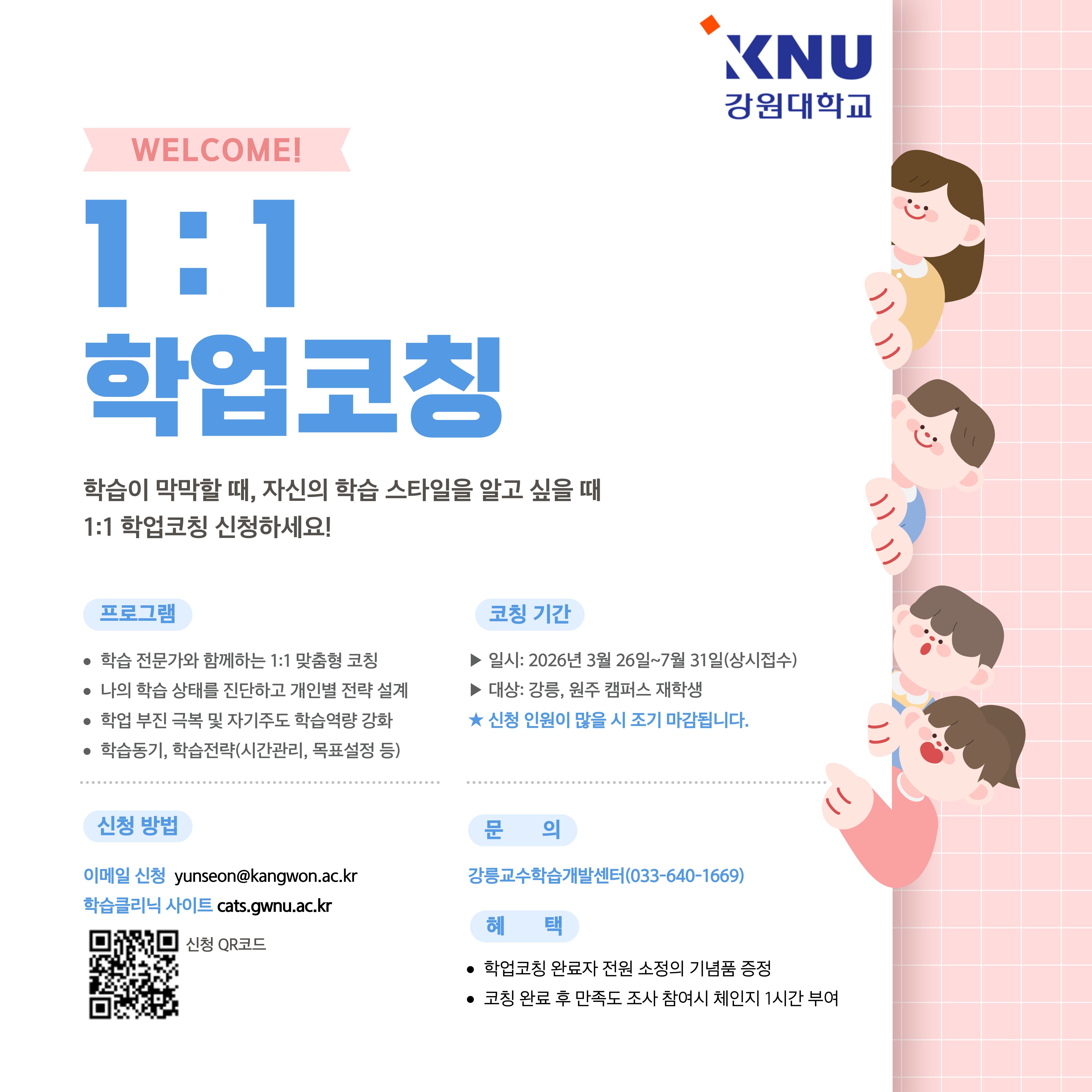 fnctId=bbs,fnctNo=804 [강릉교수학습개발센터] 2026학년도 1학기 1_1 학업코칭 실시 안내 작성일 2026.03.27 작성자 김혜리 조회수 39 첨부파일 1. 학습역량 검사 및 1대1 학업코칭 신청서.hwp