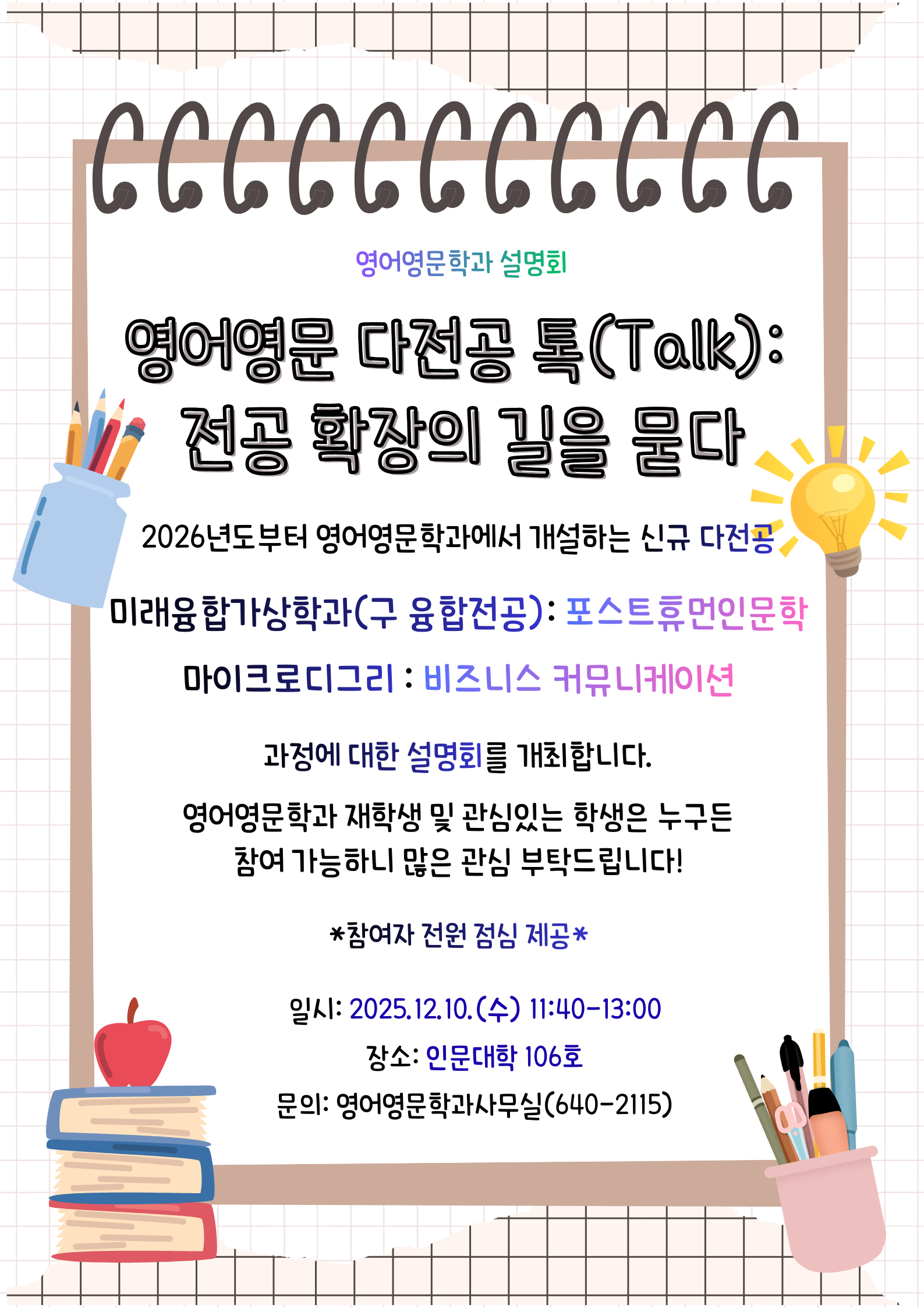 fnctId=bbs,fnctNo=755 영어영문학과 다전공 설명회 개최; 영어영문학과 다전공 톡(Talk): 전공확장의 길을 묻다 작성일 2025.12.03 작성자 김현희 조회수 983 첨부파일 첨부파일이(가) 없습니다. 다음글 이전글 2026학년도 1학기 국가장학금 1차 신청 안내(국가근로장학 포함) 김현희 2025-12-03 14:28:37.0