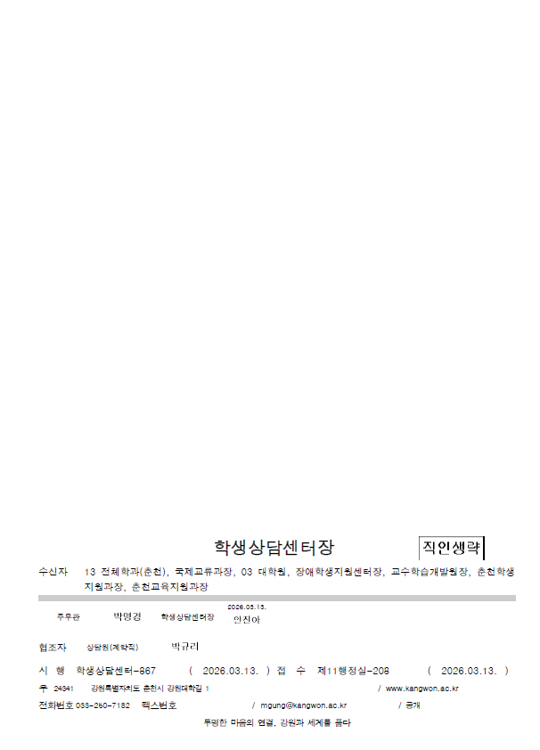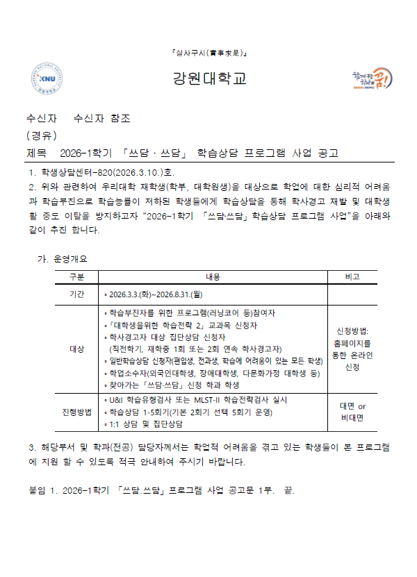 fnctId=bbs,fnctNo=840 2026-1학기 「쓰담·쓰담」 학습상담 프로그램 안내 작성일 2026.03.17 작성자 원민정 조회수 233 2026-1학기 「쓰담·쓰담」 학습상담 프로그램 안내 기간 : 2026.3.3.(화)~2026.8.31.(월) 첨부파일 1.[공고문] 2026-1학기 '쓰담.쓰담' 프로그램 사업공고.pdf 2026-1학기 「쓰담·쓰담」 학습상담 프로그램 사업 공고.pdf