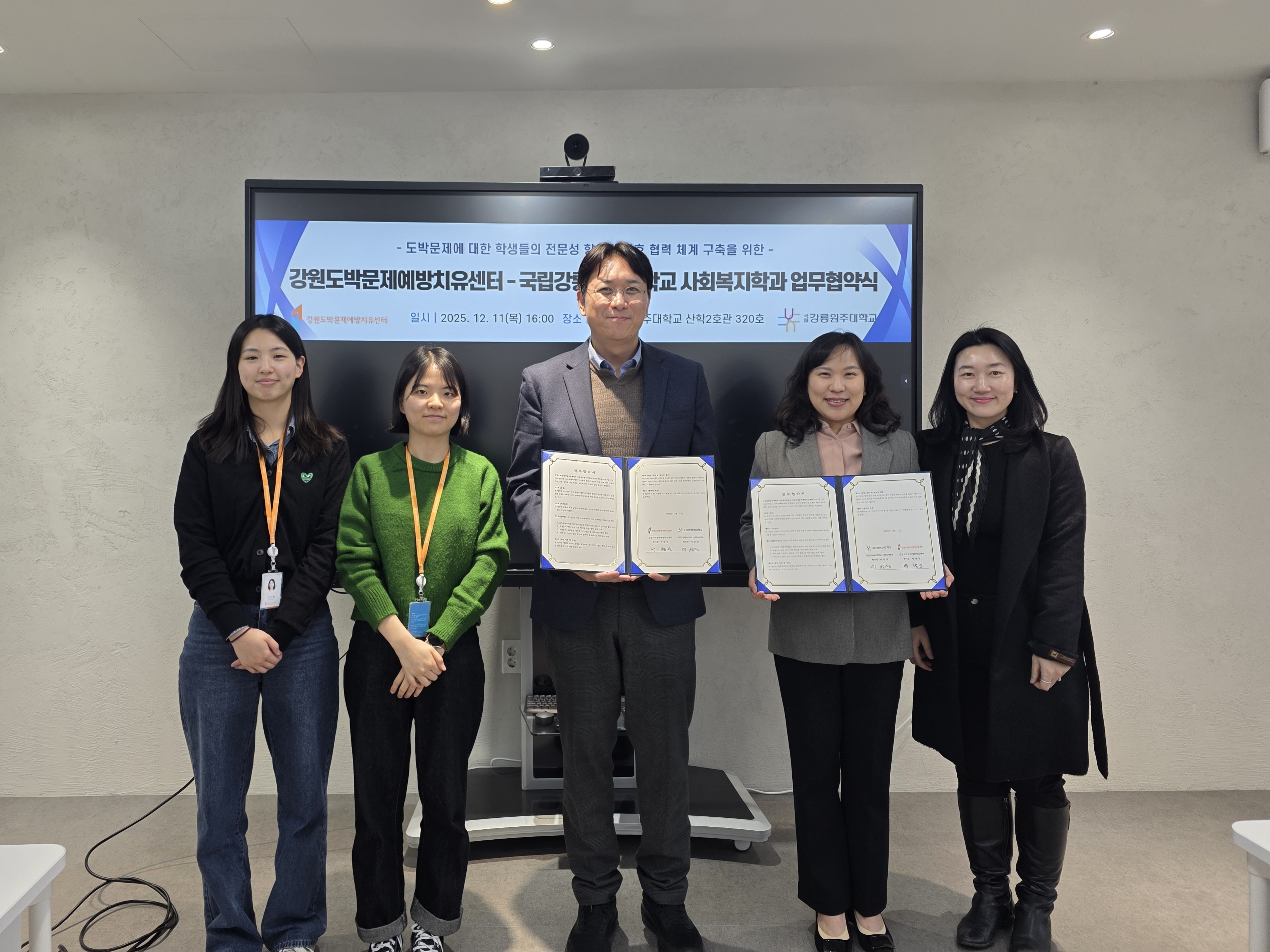 사회복지학과-강원도박문제예방치유센터, 업무 협약 체결사회복지학과-강원도박문제예방치유센터, 업무 협약 체결도박문제에 대한 학생들의 전문성 향상과 상호 협력 체계 구축 사회복지학과(학과장 이선영)와 강원도박문제예방치유센터(센터장 박병2025.12.15 -
